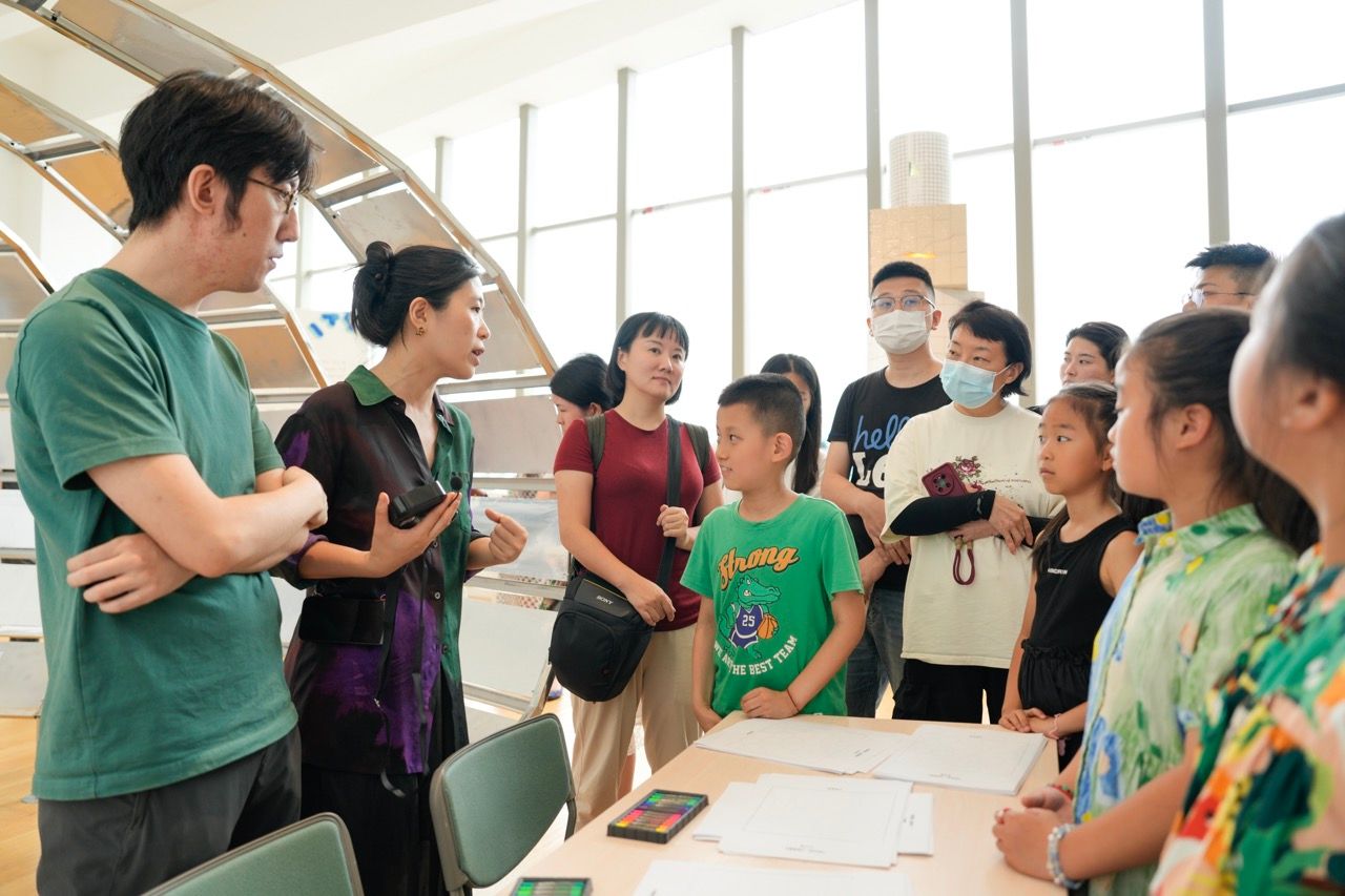 活动第一阶段以2025届实验艺术学院科技艺术方向毕业生的创作导览开启。小朋友们在创作者的带领下,深入了解科技艺术作品背后的创作动机、媒介选择与生成逻辑,初步认识AI算法、AR交互、材料演化等科学概念如何转化为艺术语言。