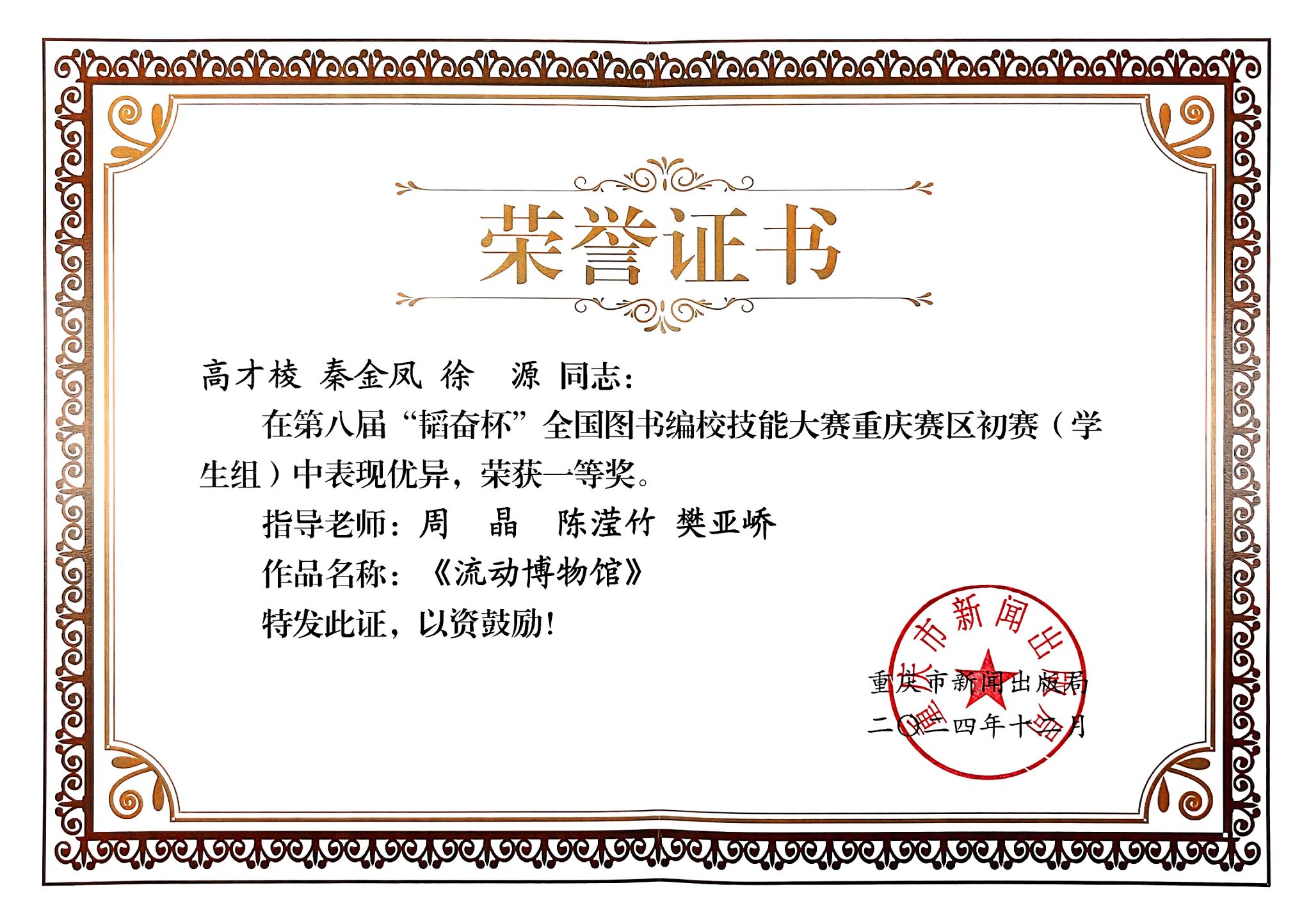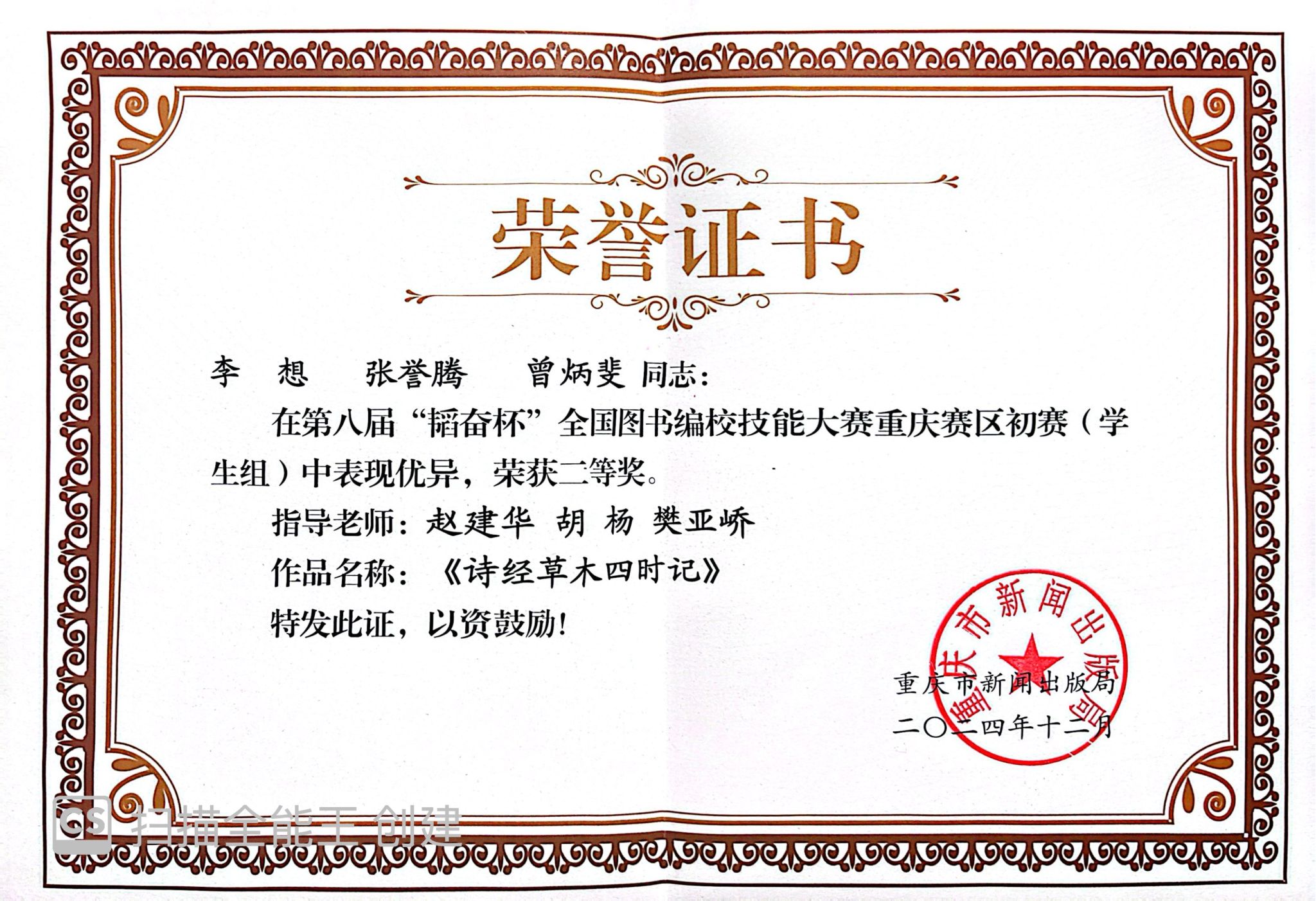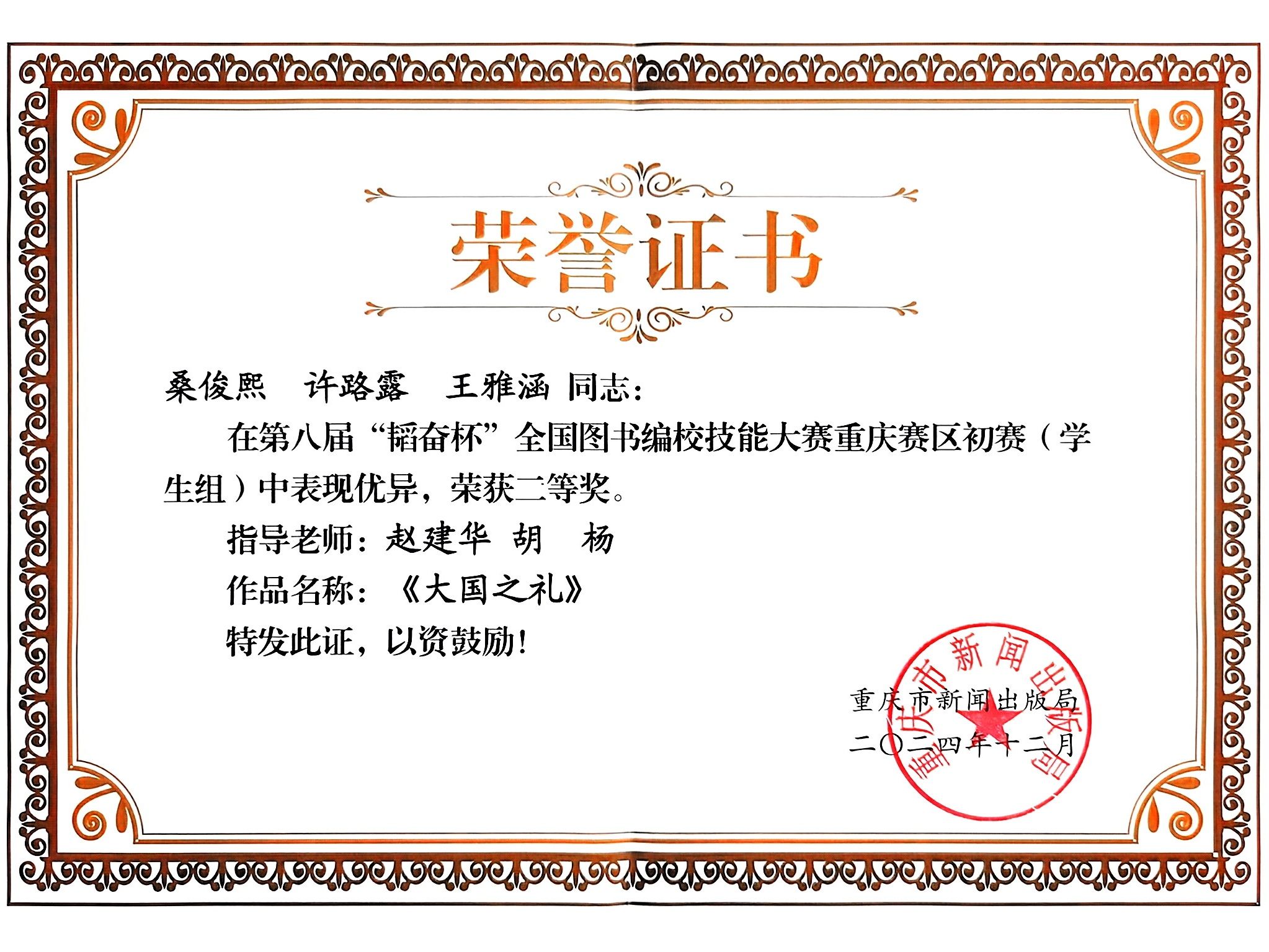 2024 年 8 月,国家新闻出版署发布赛事通知(国新出发〔2024〕13 号),重庆市新闻出版局于 10 月启动重庆赛区初赛。 艺术教育学院组建 4 支队伍参赛,在重庆赛区初赛中获得1个一等奖、3个二等奖和优秀组织奖。其中,胡杨老师、赵建华老师带领的本科生团队《大国之礼》(桑俊熙、许路露、王雅涵)与何彤老师、樊亚峤老师带领的研究生团队《非遗美育教学设计与实践案例》(邱思瑶、张艺颖、方艺洁)两支队伍作为重庆代表队,于2024年12月26至27日赴北京参加全国决赛,与来自中国传媒大学、南开大学等全国30余所重点院校的研究生和本科生同场竞技,最终分获全国三等奖。