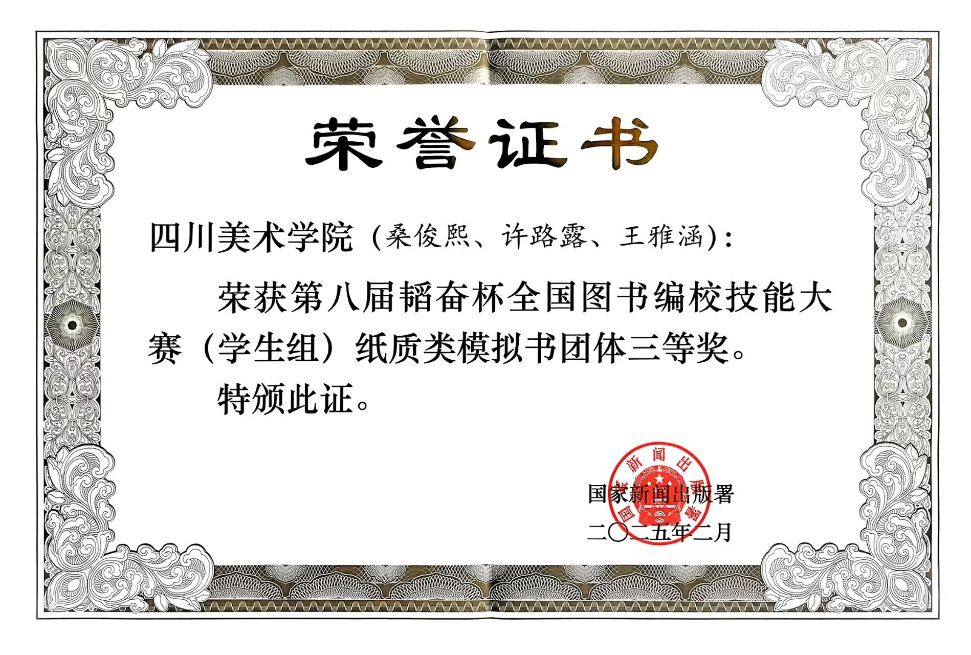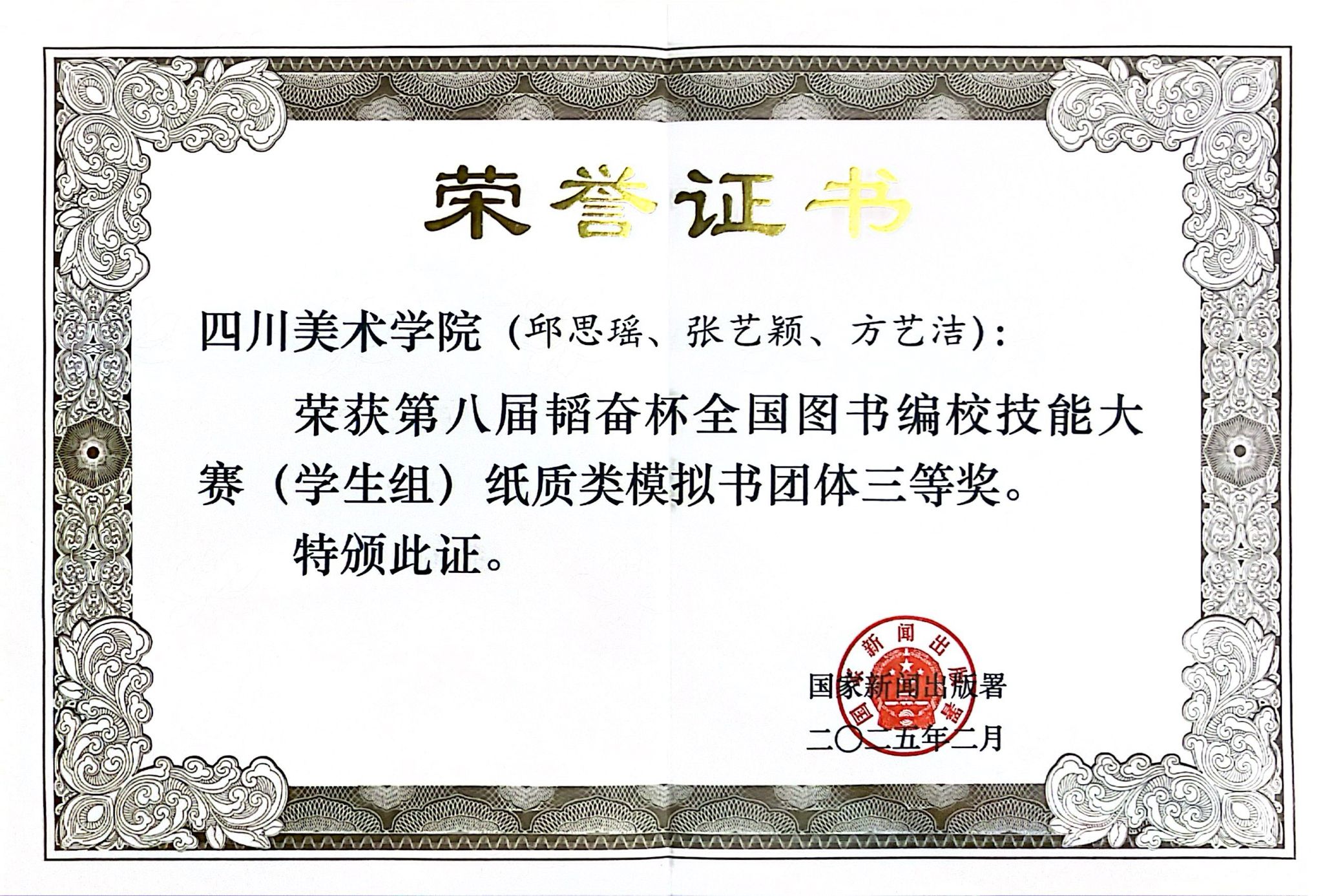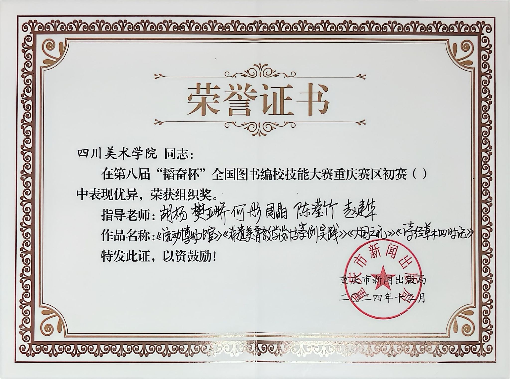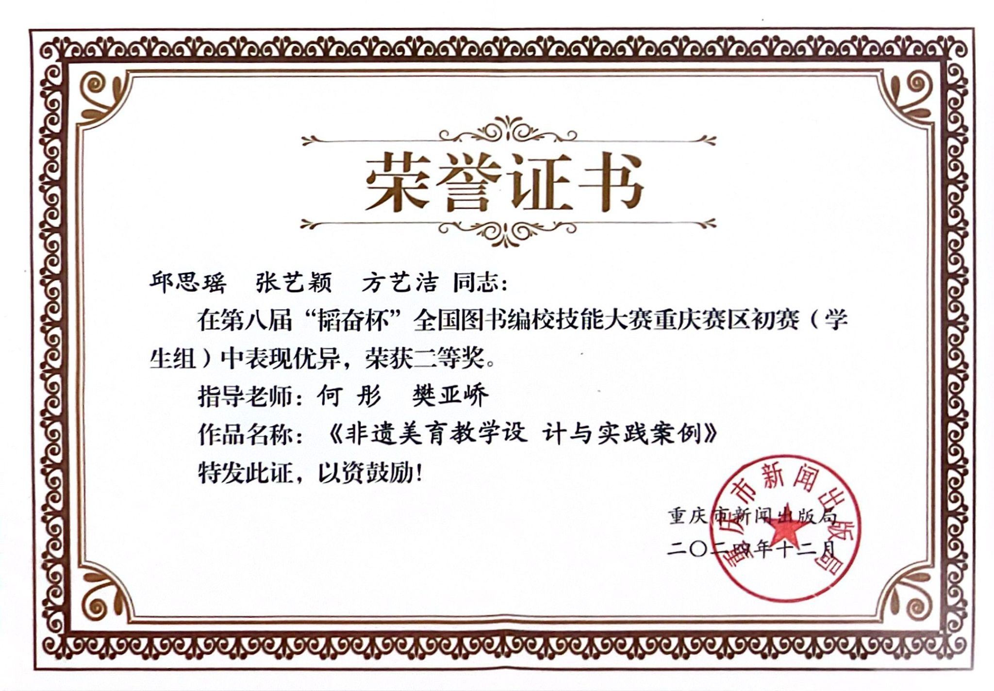 6月26日,第八届韬奋杯全国图书编校技能大赛颁奖典礼在重庆新华出版集团举办。我校艺术教育学院学子在此次赛事中表现突出,斩获全国三等奖2项,市级一等奖1项,二等奖3项,优秀组织奖1项,实现重庆赛区在此项重要国家级比赛中零的突破。重庆市委宣传部、市新闻出版局、市出版协会等相关领导出席并为市级获奖团队颁发证书。