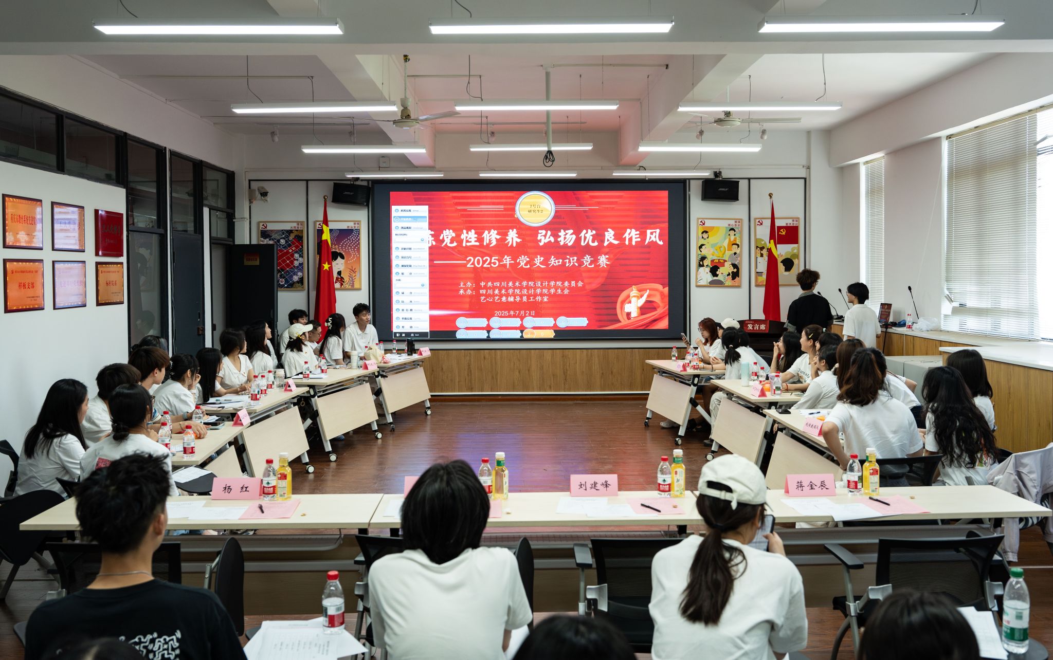 为庆祝中国共产党成立104周年,7月2日下午,由设计学院党委主办,设计学院学生会、艺心艺意辅导员工作室承办的2025年党史知识竞赛在虎溪校区举行。建筑与环境艺术学院党委书记刘建峰、设计学院党委书记陈勇、设计学院党委副书记杨红、设计学院副院长蒋金辰为比赛评委。工业产品专业、服装专业、视传数媒专业、工艺美术专业、设计学专业和研究生入党积极分子组成7支队伍参赛。学院百余名预备党员、入党积极分子观赛。