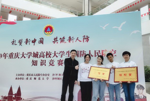 由沙坪坝区民防办主办、重庆师范大学承办的“礼赞新中国,共筑新人防”2019年重庆大学城高校大学生国防人民防空知识竞赛,于9月17日下午在重庆师范大学校友会堂举行。我校荣获现场竞赛二等奖、网络答题组织奖。此次活动共评选出一等奖1名、二等奖2名、三等奖3名。