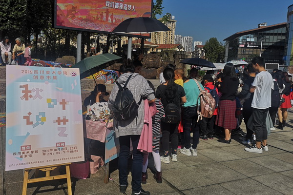 10月19日,艳阳高照,秋风送爽,美术馆前游人如织。由共青团 委员会主办、校学生会承办的“秋叶识艺”川美创意集市活动在我校虎溪校区美术馆前小广场热烈举行。