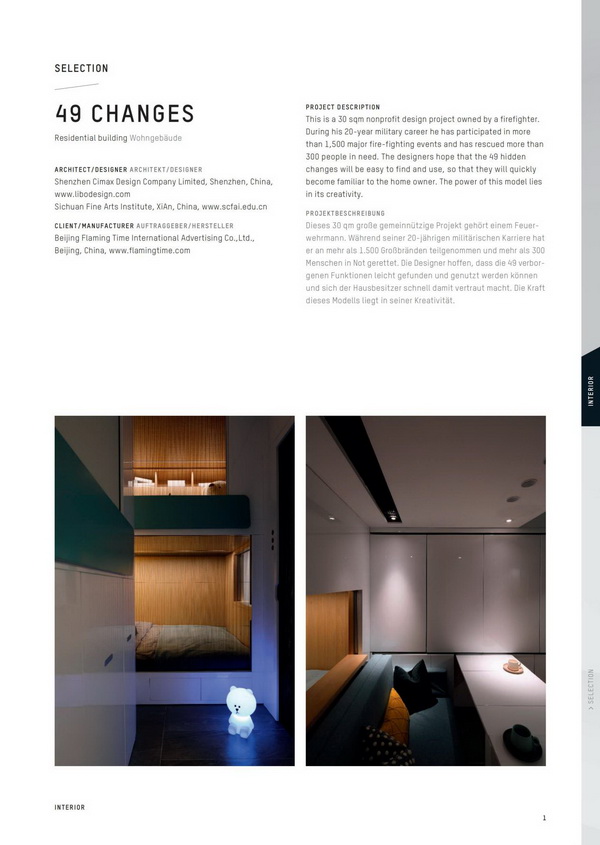 本次获奖作品 《49 CHANGES》 (又名:TRANSFORMERS /变形金刚),日前亦已斩获 2019德意志联邦共和国国家设计奖 (GERMAN DESIGN AWARDS 2019) 和 入围WAF 世界建筑节INSIDE AWARDS 2019, 赢得了多个国际顶级赛事的认可。