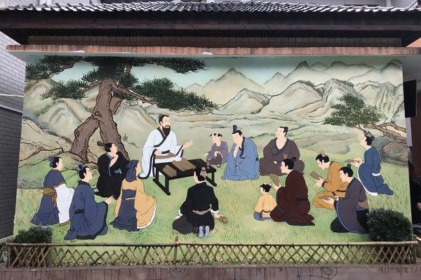 11月4日上午,老师及全体同学到场绘制。《孔子讲学图》位于校内门卫室外侧墙,正对操场,墙面高3米、长5米,该幅作品为2017级壁画专业学生设计完成。表现了我国古代伟大的思想家、教育家孔子2500年前的授课场景:慈眉善目的孔子坐在一棵苍翠的松树下,远山如黛,弟子们围坐老师身旁,聆听讲学,课堂气氛轻松活跃。通过这幅壁画教育同学们在任何环境条件下,都要坚持学习,以此激发学生的学习热情。学校操场外墙的《天元山水》,画中的青山绿水与小学外现实中美丽的山水风光交相辉映,展现了绘画意境与自然意境交融共鸣的特別效果,旨在激发当地老百姓热爱家乡、建设家乡,增强脱贫致富的信心和热情。两幅作品的构思立意与画面内容与天元乡小学的內、外环境恰如其分的巧妙融合。《天元山水图》位于在校外围墙,毗邻前江,墙面总长80米、最高处达到7米,该图为我校公共艺术学院2016级壁画专业学生设计完成。