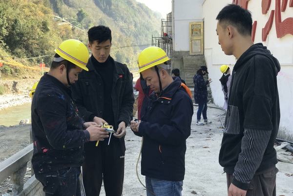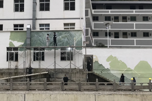 老师和同学们积极投入绘制,合理分配绘画区域,调色、上色、勾线......老师指导、把控,同学爬上高高的脚手架认真操作。11月5日, 党委副书记左益及市教委扶贫集团来到现场慰问指导。