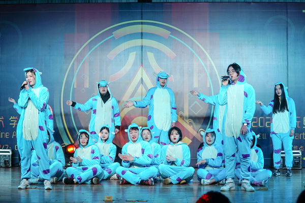 晚会节目形式多样、内容丰富、创意十足、精彩纷呈。吉他社团带来的乐队开场秀迅速将现场气氛点燃。随后,油画、版画、雕塑三个系的同学轮番上台,为观众呈现了一场精彩的晚会。油画系2019级3班的《梵高的一生》、油画系2019级1班的《烈火中永生》、雕塑系2019级1班的《恐惧症互助会》等语言类节目,既展示了同学们精湛的演技,也获得了在场观众的一致好评。油画系2019级2班的《Cups—when I’m gone》、雕塑系2019级2班的《动物世界》、版画系2019级3班的《快乐循环》、版画系2019级2班的《最美的期待》、版画系2019级1班的《曾经的星星》和雕塑系学生会文娱部带来的《影流之主》等歌舞类节目,更是博得了满堂彩。由造型艺术学院学生带来的民族舞《额尔古纳河》,以优美的舞姿、新颖的舞蹈表达方式展现蒙古舞的生命力。晚会的高潮来自于版画系、雕塑系老师们带来的两首合唱,老师们展现了与课堂上截然不同的一面,让同学们既意外又倍感亲切。