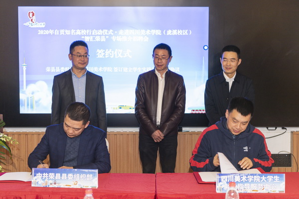 会上,自贡市委组织部部委委员宋代平、荣县县委常委、宣传部部长但海君分别作自贡、荣县人才环境推介。我校学生处处长杜泰山、荣县组织部副部长吴文根共同签订了共建学生社会实践基地合作协议。