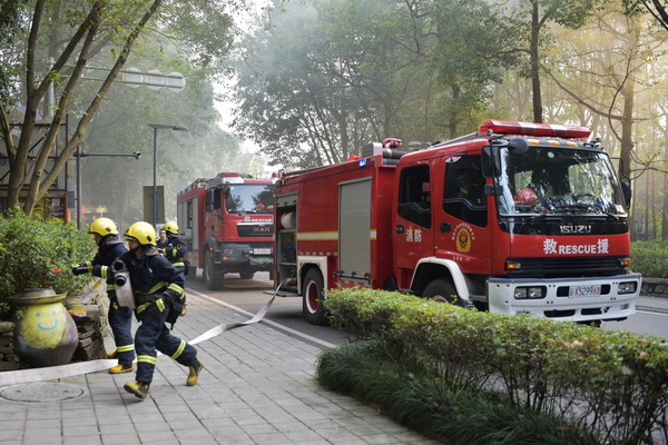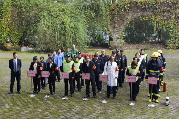 培训会结束后,全体参会人员移步到断桥广场,与各二级学院学生代表一起进行消防实战演练。在模拟火灾逃生环节,随着报警信号的响起,由物业安保人员组成的灭火组、疏散引导组、救护组、动力组、警戒组、通讯联络组、善后处置组迅速就位。疏散引导组人员进入着火楼层,沿安全出口组织人员快速有序撤离,灭火组配合消防员迅速到达着火点进行灭火,动力组迅速启动排烟系统并切断无关电源,救护组将受困人员用担架快速转移到楼外安全区域,在各个小组的密切配合下,消防实战演练顺利完成。