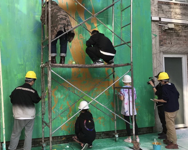 在同学们实践创作之前,影视动画学院、公共艺术学院和国际合作交流处的老师都召开会议确保学生的安全问题,杜绝墙绘实践带来的潜藏危险,后勤保障部门全力配合,为同学们配置了安全帽和安全绳,指导学生正确使用,保障活动安全顺利的开展。