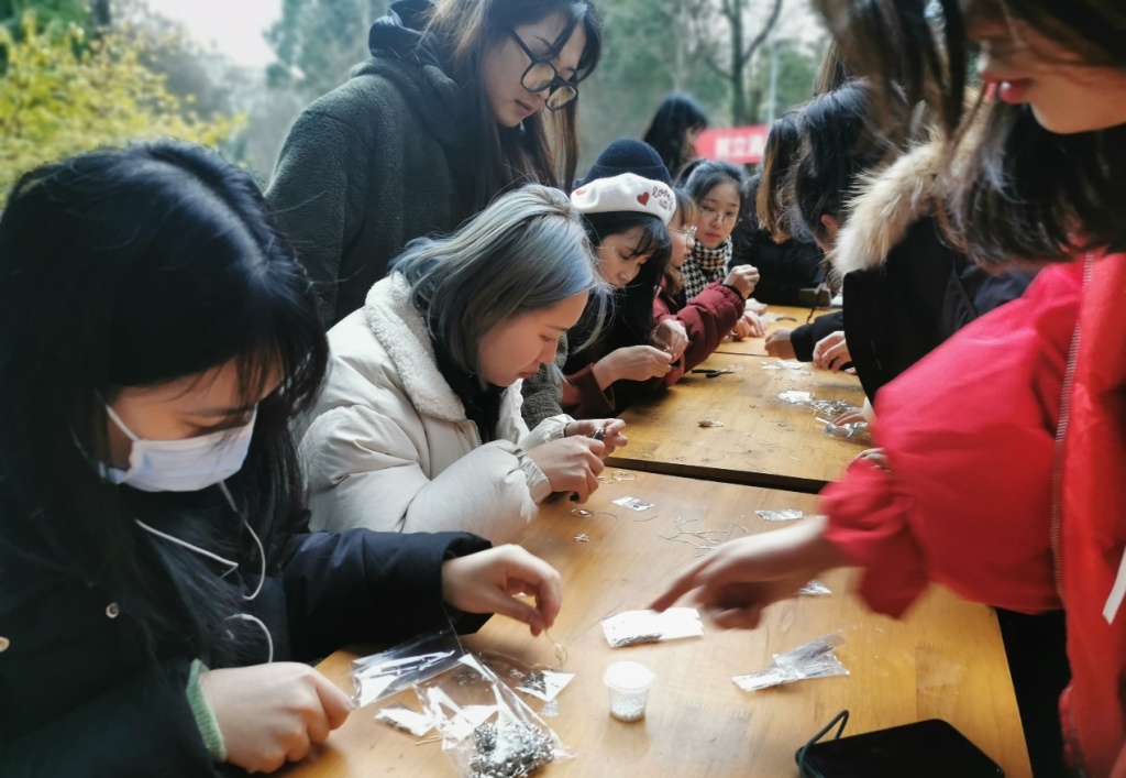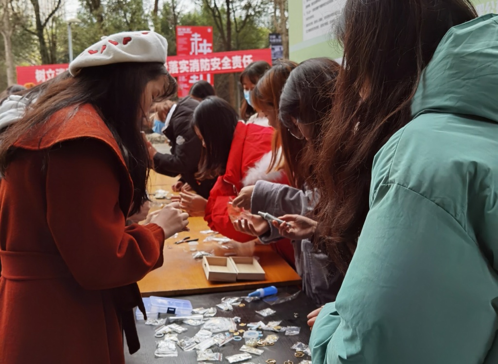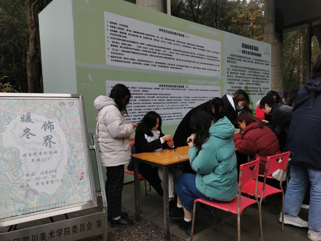 2020年12月29日下午,由共青团 委员会主办、 校学生会青年志愿者协会承办的“暖冬饰界”女生节耳饰制作活动,在虎溪校区学生食堂门口举行。
