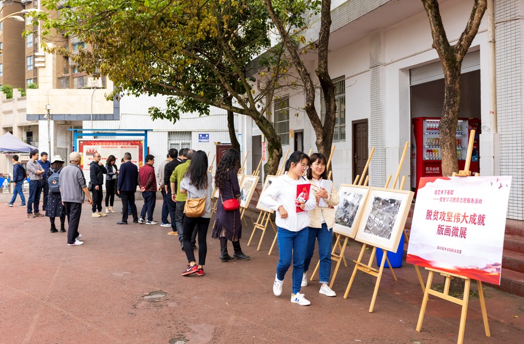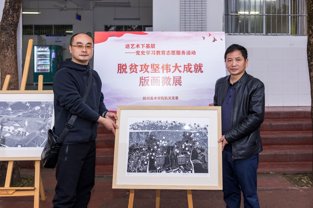 当日下午,宣传部党支部与潼南区大佛初级中学党总支开展了联合主题党日活动。大佛初级中学党总支书记、校长付强和宣传部党支部书记余晖分别介绍了双方党史学习教育的开展情况和特色活动,并就支部党史学习教育的深入推进进行了交流讨论。双方还一起参观了宣传部党支部组织的“送艺术下基层”志愿服务和为民办实事活动——脱贫攻坚伟大成就主题版画微展,用艺术的方式展现党领导人民取得的脱贫攻坚巨大成就和深刻变化,微展览深受大佛初级中学的师生欢迎。余晖向大佛初级中学党总支赠送了我校造型艺术学院版画系师生创作的《习近平新时代中国特色社会主义思想绘本》和脱贫攻坚主题版画作品。