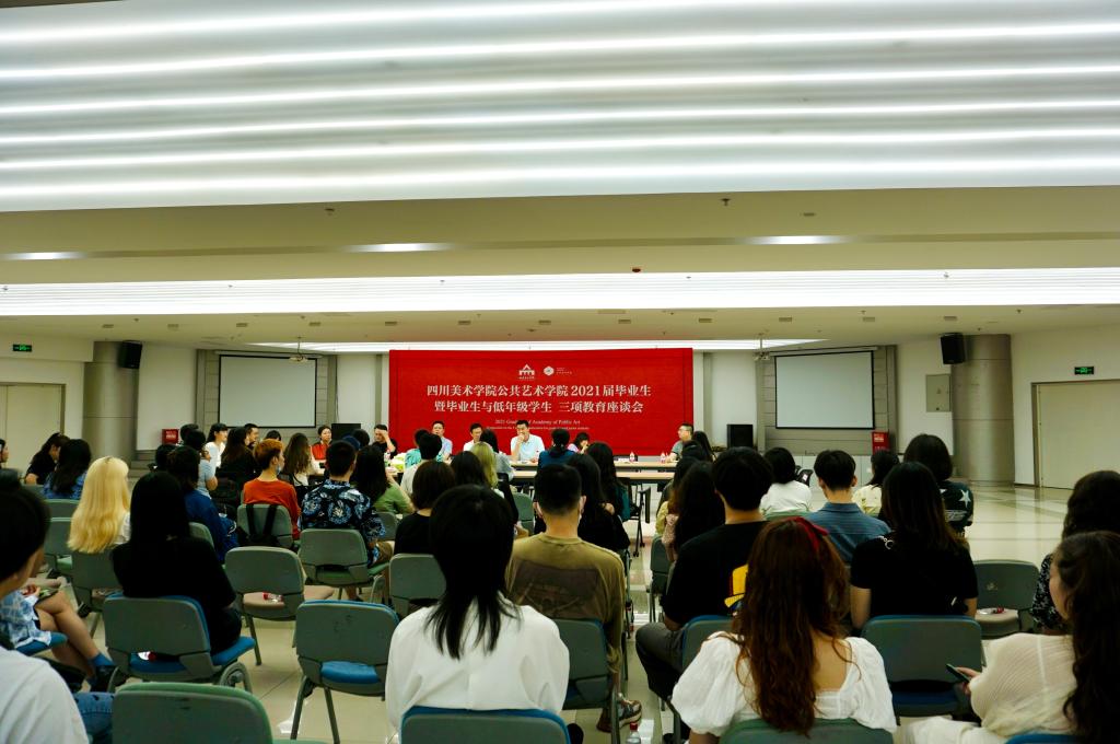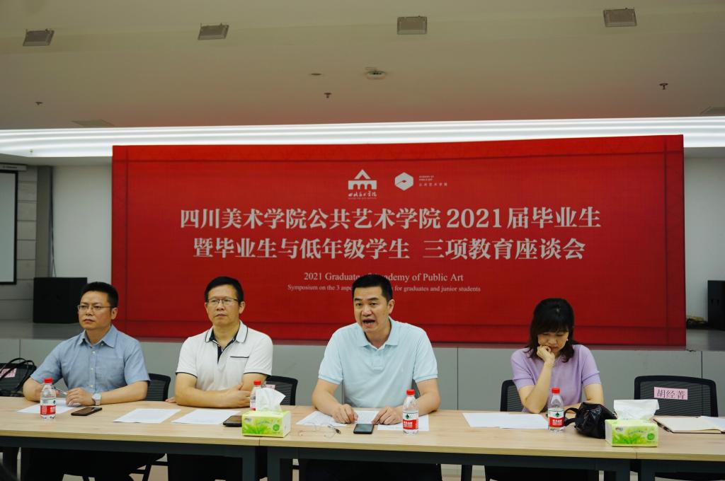 6月28日上午,公共艺术学院三项教育座谈会在黄桷坪校区多媒体厅召开。公共艺术学院党总支书记雍朝永、院长郭晏麟、党总支副书记郭小兵、副院长魏婷,公共艺术学院各办公室主任及工作室主任、辅导员、优秀毕业生及部分低年级同学等80人参加会议。座谈会由郭小兵主持。