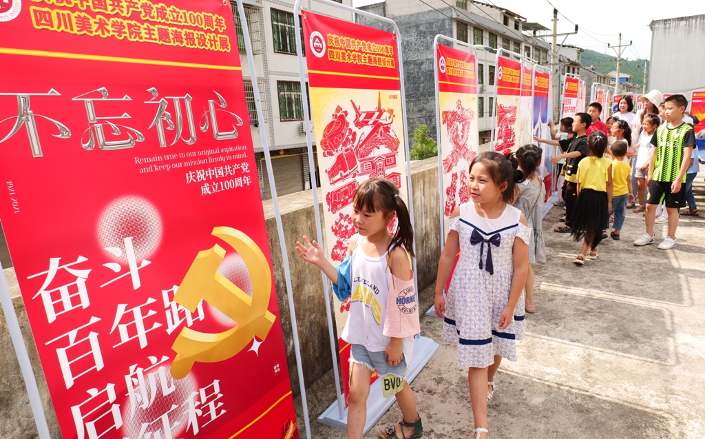 期间,师生们先后到多地走访,对该地区脱贫攻坚成果和乡村振兴工作进行了深入调研。在充分调研的基础上,影视动画学院社会实践团队充分挖掘酉阳县天馆乡深厚的农耕文化和当地农产业特色,把乡村振兴与文艺下乡有机结合起来,将党史学习、乡村美育、文创设计、非遗传承贯穿一线,开展了庆祝中国共产党成立100周年主题海报展览、彩绘村落、乡村少年美育课、木叶吹奏非遗传承人访谈和茶文化品牌设计等活动,积极助力乡村振兴。