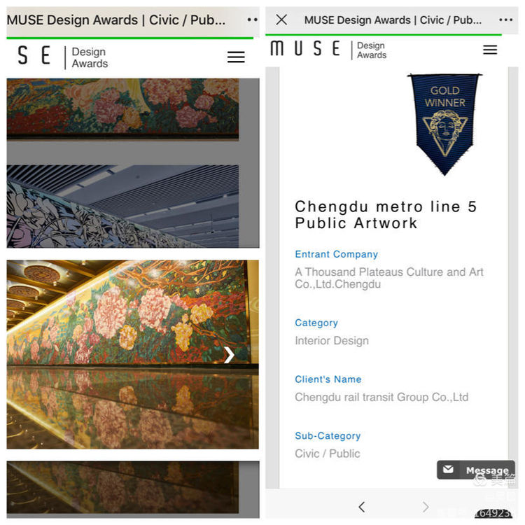 近日,美国缪斯设计奖(MUSE Design Awards)2021第二届全球获奖榜单公布,由中标设计单位成都千高原文化艺术有限公司推送申报、我校吴松教授主创的成都地铁5号线皇花园站《花重锦官》壁画、贵阳地铁二号线泉湖公园站《生态之城》壁画、贵阳地铁二号线机场站《多彩贵州欢迎您》壁画,一起荣获2021第二季“美国缪斯设计奖(MUSE Design Awards)”金奖(室内设计类别公共艺术)。人民网、光明网、中新网、成都日报、四川发布、贵阳电视新闻等媒体进行了广泛报道。