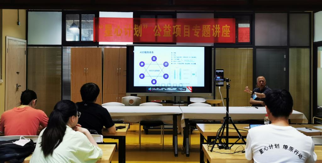 讲座采取“线上+线下”的方式开展,线下参加讲座的有“星心计划”全体学生及导师、学校党政办杨寒老师及国书院唐毅老师、哈佛大学附属麻省总医院自闭症研究实验室夏田研究员、西南大学临床与咨询方向硕士智星康儿童医院心理咨询师许洁,以及自闭症儿童家长,一起参加互动讨论。讲座围绕自闭症“脑科学”与“艺术”主题,以“沙龙讨论”的方式展开,在多方互动过程中,取得了很好的成效。