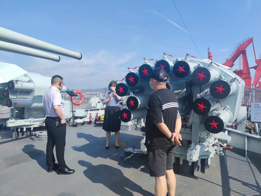 在讲解员的带领下,同志们参观了166舰主甲板、前主炮、防空导弹和尾部主炮,以及指挥所、驾驶室、船员室、厨房等区域,随后参观了建川海疆博物馆博物馆。