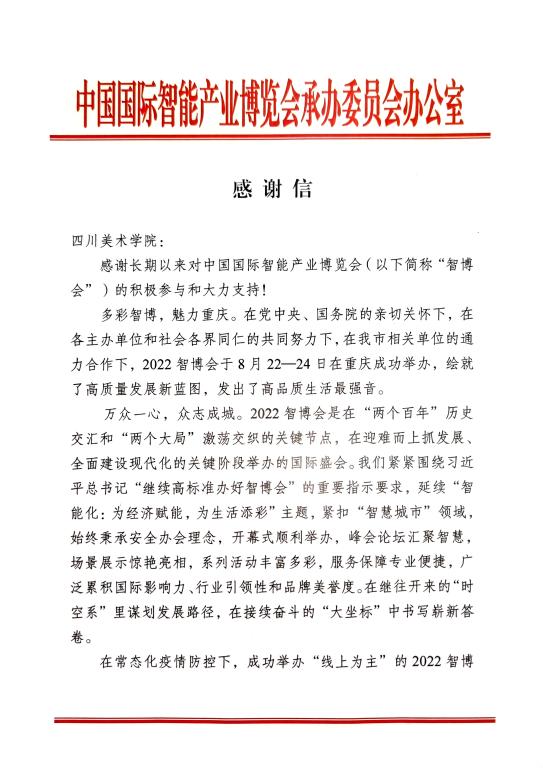 近日,中国国际智能产业博览会承办委员会向我校发函致谢,对我校在2022中国国际智能产业博览会的志愿工作表示感谢。