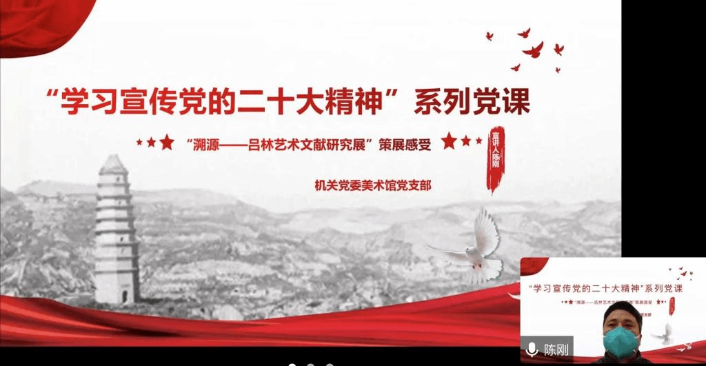 按照《中共 委员会关于认真学习宣传贯彻党的二十大精神的通知》文件要求,机关党委美术馆党支部为深入学习宣传贯彻党的二十大精神,于12月27日下午继续开展“党课大家讲”系列活动,以调动支部同志们积极主动的政治理论学习热情。本次党课是今年支部“党课大家讲”系列活动的第四讲,以线上方式进行,由支部书记李芳主持,支部所有党员同志和入党积极分子参会。