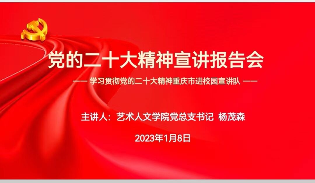 为深入学习贯彻党的二十大精神,引导全体党员、师生将思想和行动统一到二十大精神上来,按学校党委的部署要求,艺术人文学院于2023年1月8日下午通过腾讯会议开展了党的二十大精神宣讲,推动形成学习宣传贯彻二十大精神热潮。此次宣讲会由艺术人文学院党总支书记、副院长杨茂森主讲,总支委员陈勃主持,学院全体师生在线参加了学习。