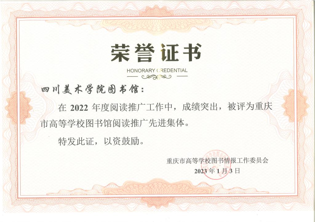 2023年4月4日,重庆市高校图工委2023年馆长会暨2022年先进表彰会在重庆大学举行。会议为获得“2022年重庆市高等学校图书馆先进集体和先进工作者”的单位颁奖。我校图书馆荣获“2022年重庆市高校图书馆阅读推广先进集体”,图书馆馆员刘汉琴获评“2022年重庆市高校图书馆先进工作者”称号。