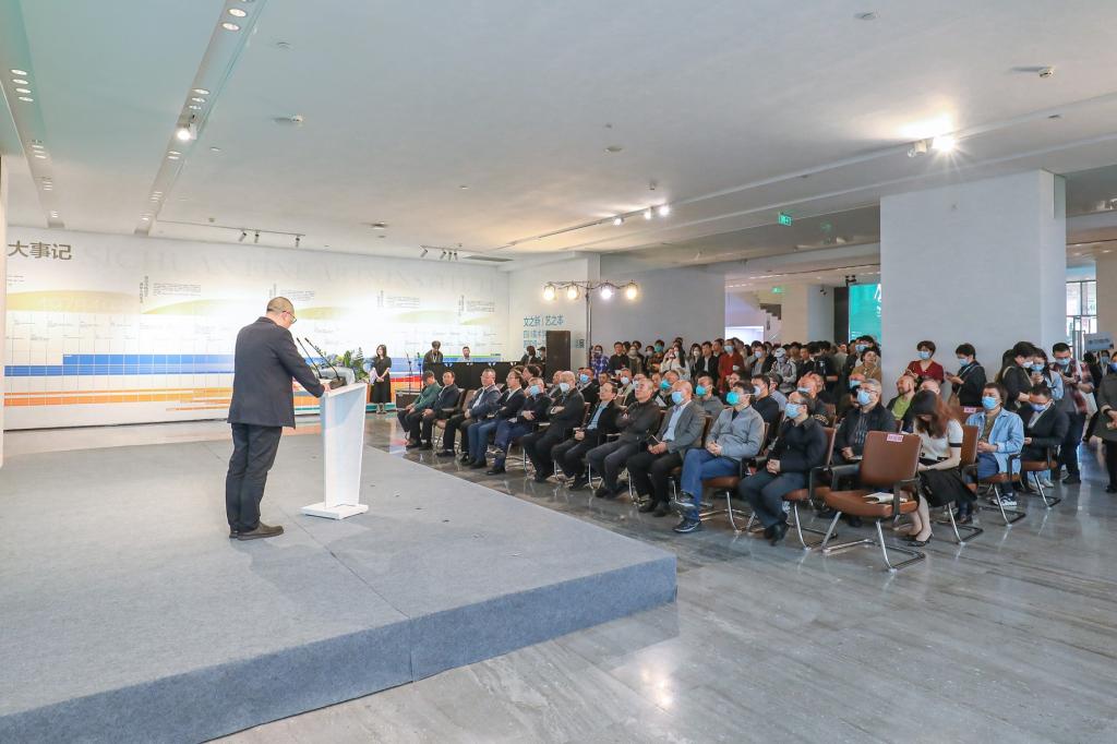党委书记唐青阳首先在开幕式中致辞,他说道:在这万物生长的初夏之际,封治国、赵晓东两位艺术家开启双个展对话,我们非常高兴与中国美术学院共聚山水之城,畅叙友谊,深化合作,共谋发展。封治国、赵晓东两位艺术家,一位稽古钩沉,一位人间烟火,但都拥有着共同的精神气质和价值关怀;他们的作品是时代生活和精神的生动写照,兼具纵横挥洒与凝练克制,呈现出的时代况味是精品文艺作品的要求所在;此次 与中国美术学院艺术家的双个展活动,既是两校之间交流借鉴、合作共进的体现,又是区域之间携手努力,共促新时代中国美术事业高质量发展的具体行动,期待中国美术学院与 两校的兄弟友情恒久长青。