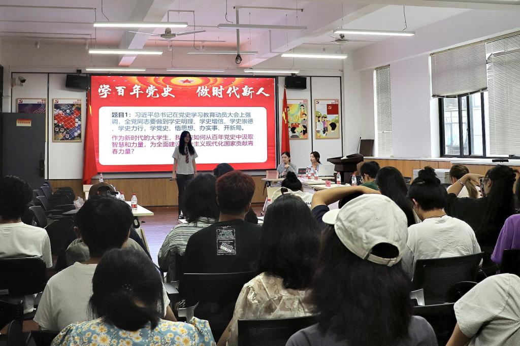 在全党上下深入开展学习贯彻习近平新时代中国特色社会主义思想主题教育之际,为牢牢把握“学思想、强党性、重实践、建新功”的总要求,鼓励同学们从立党兴党强党的历史中汲取精神滋养,切实做到学史明理、学史增信、学史崇德、学史力行。在建党节即将来临之际,设计学院党总支于6月21日下午,在G402举办了“学百年党史 做时代新人”主题教育暨党史知识竞赛。本次竞赛由工业产品专业、服装专业、视传数媒专业、工艺美术专业、设计学专业和研究生入党积极分子组成7支队伍,邀请了马克思主义学院直属党支部副书记王凤英老师、马克思主义学院杜雪晖老师、设计学院党总支书记陈勇老师、设计学院骆玉平老师做比赛评委,学院百余名入党积极分子观赛。