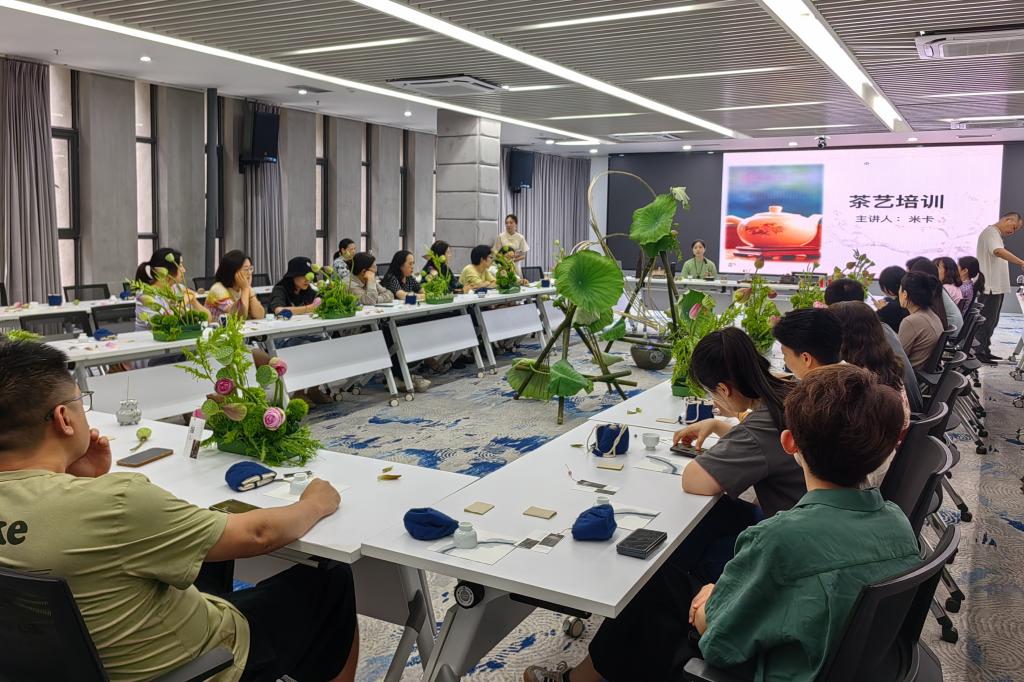 活动场地的布置和主题非常契合,荷风送香气,竹露滴清响,每一位参与者在炎炎夏日顿感神清气爽。茶艺老师首先向大家进行了一些茶艺知识的普及,比如茶的分类、茶艺原理、饮茶技术、茶文化等,随后,大家品尝了绿茶、红茶、白茶、岩茶、黑茶、普洱等各色茗茶,相互讨论茶的种类及口感,在泡茶的过程中去读懂茶、识茶性。最后,老师还带领大家一起感受了活茶、颂钵,大家都沉浸其中,深感美好。