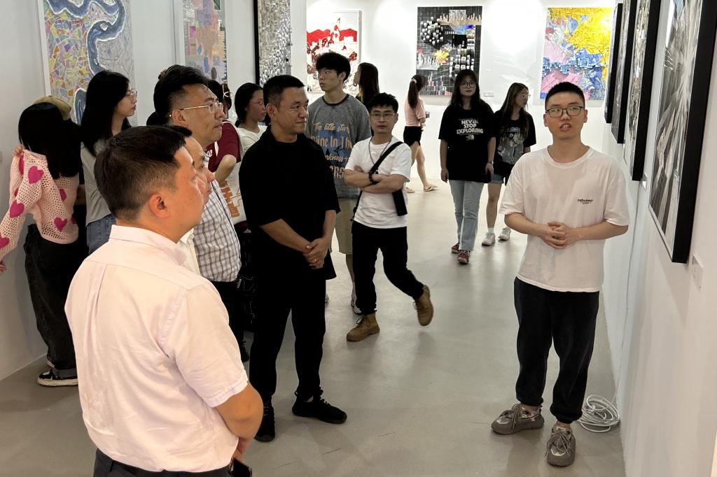 本次展览是2023年公共艺术学院推进课程思政的教学成果展示,共展出教师作品8件、2023届毕业生作品5件和“城市意象”课程作品17件。开幕式后,学院师生参观学习本次展览,城市空间艺术设计专业学生尧艾和吕春颖为参观人员现场介绍作品。