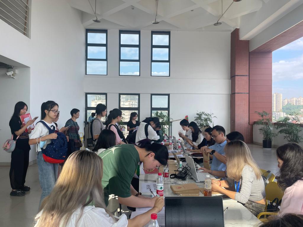 综合楼广场上,各部门提前谋划,创新工作举措,为迎接新生的到来设立了许多有特色的迎新方式:校门口映入眼帘的标语“热烈欢迎来自五湖四海的2023级新生”“热烈欢迎2023新川美人”,让新生有一种回家的感觉;综合楼前的超大打卡框,让新生及家人可以留下宝贵的回忆;校园里随处可见的指示牌,为新生带来踏实感和归属感;宿舍出入口领取校园卡和办理校园网络的便捷服务台,让新生省时省力;对学校各类学生组织进行宣传的学生手册,使新生尽快成为一个真正的“川美人”……迎新现场的热烈景象,让每一位初入校园的新生,都感受到了川美黄桷坪校区澎湃的青春活力。