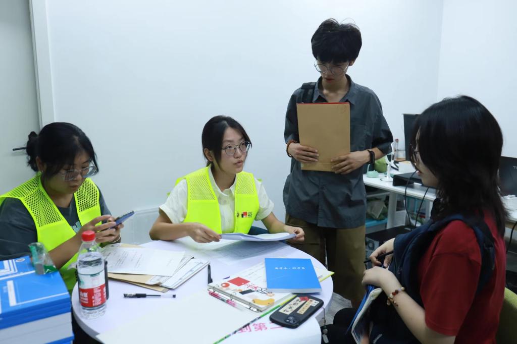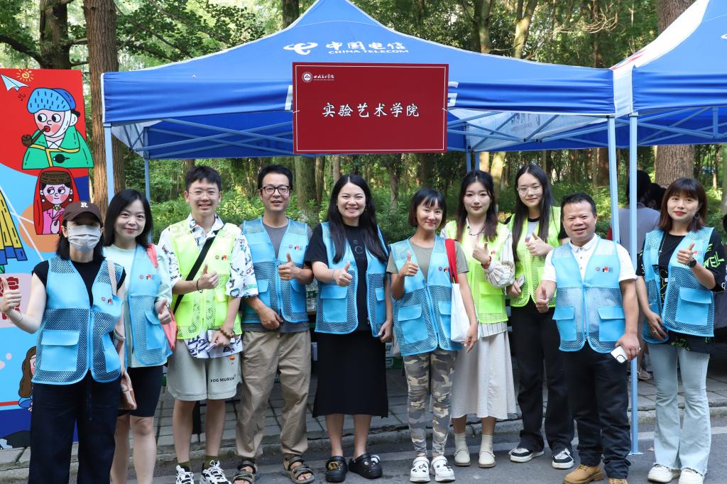 清晨时分,实验艺术学院的迎新志愿者们已集结完毕,身着蓝色和绿色的志愿者马甲,在学校南门迎接接待点等待着新生和家长的到来。