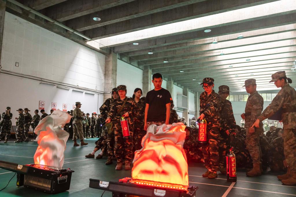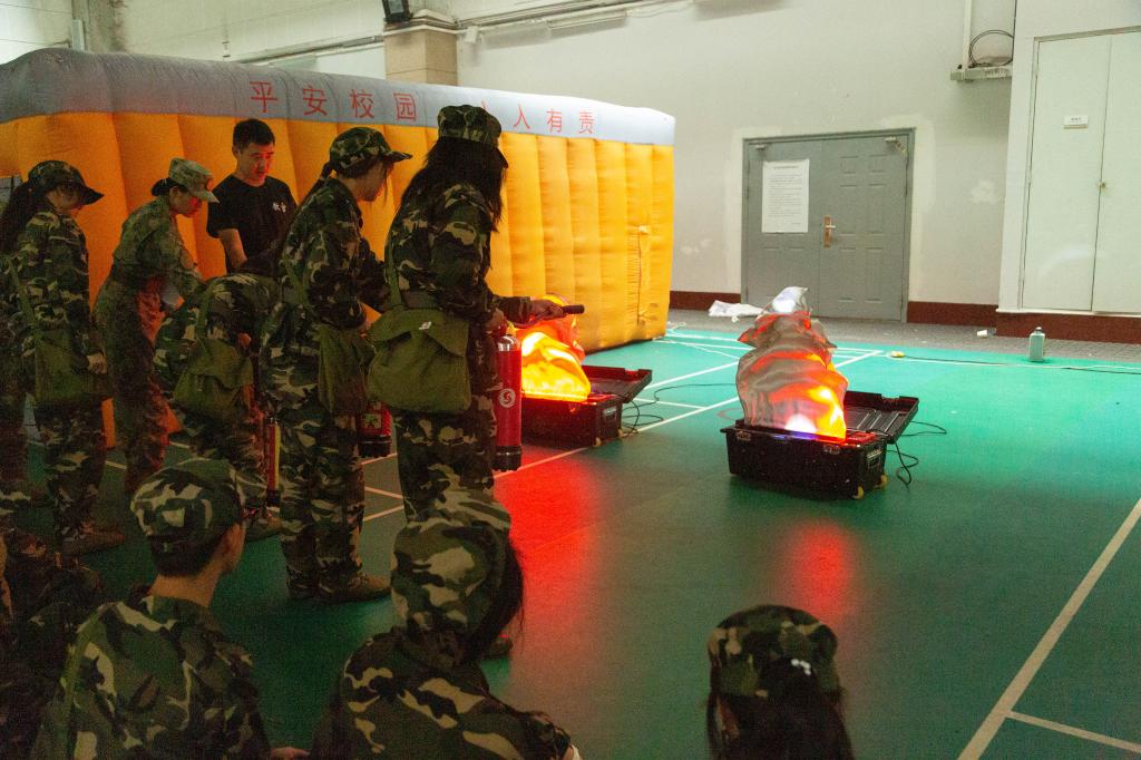 最后,保卫处秦梨老师带领新生转入模拟灭火演练和火灾逃生体验的实操环节。同学们在专业指导下按照灭火的步骤要领,轮流进行了现场操作体验。