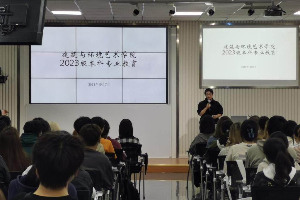10月7日,建筑与环境艺术学院开展2023级本科新生专业教育,学院领导班子、各系主任、教学秘书、辅导员参加。会议由副院长黄红春主持。会上,党总支书记刘建峰从学校“志于道、游于艺”的校训到习总书记对青年们的殷切希望,提出同学们要做一个有道德修养、专业素养和发展潜质的人,在川美放飞梦想、踏实耕耘、收获成功。院长黄耘对学院的专业布局与目标定位、培养模式与课程体系、课程资源与特色培养、特色创新与就业发展进行综合介绍。各系分别对建筑学、风景园林、环境设计三个专业进行详细解读。院长、主任们的讲解图文并茂、生动形象、深入浅出,同学们听得专心,不时发出惊叹、掌声和欢笑声。