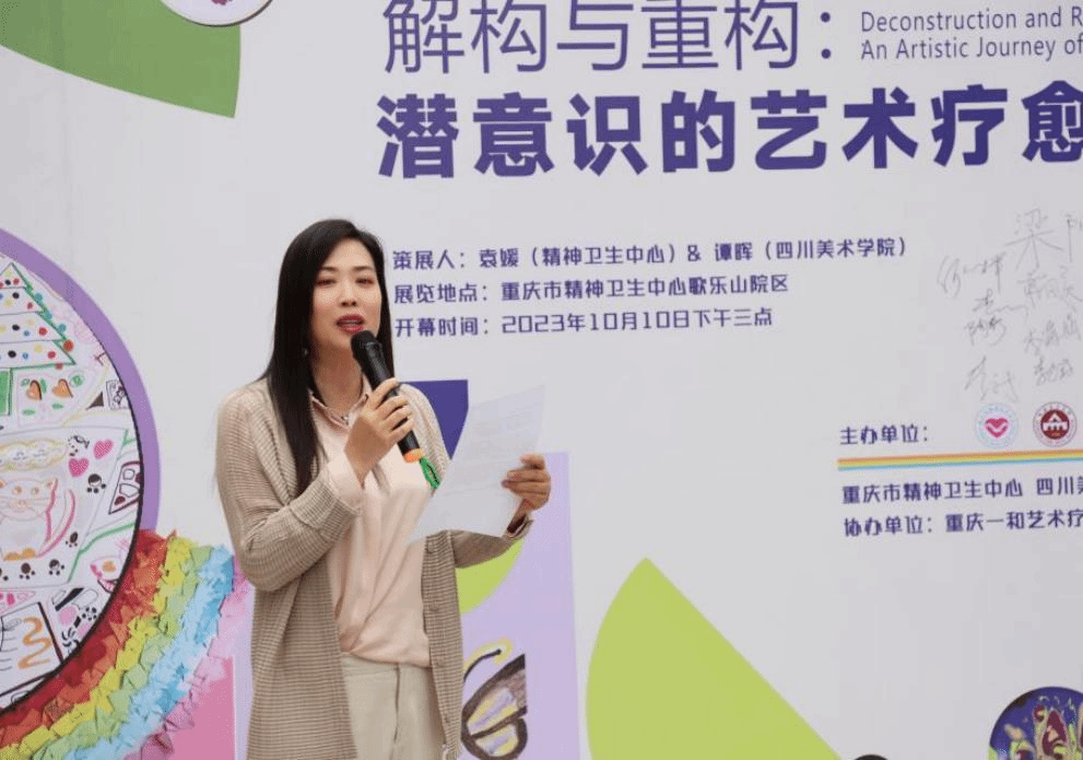 2023年10月10日,在第32个世界精神卫生日到来之际,《解构与重构:潜意识的艺术疗愈之旅》展览在重庆市精神卫生中心开幕,展览由 谭晖副教授和重庆市精神卫生中心袁媛副主任医师联合担任策展人, 建筑与环境艺术学院和重庆市精神卫生中心联合主办,重庆市一和艺术疗愈中心协办。