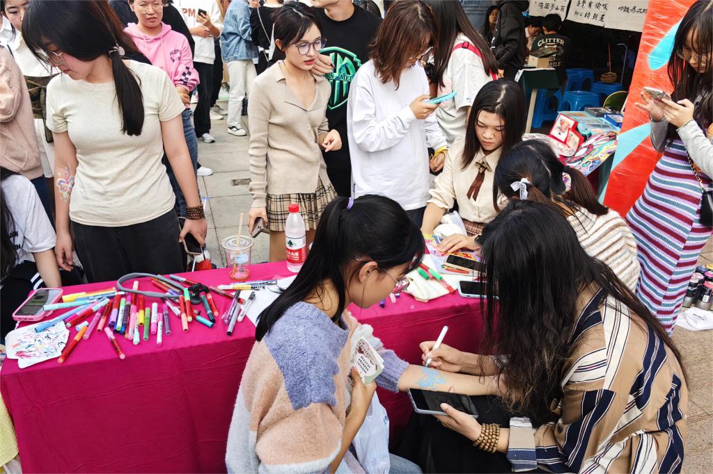 活动期间,两个社团集中展示了社团成果并结合学校特色与现场观众交流互动。文学社展出近几年社团内出版及编撰的文学刊物,并与书法、汉服社合作,在现场进行书法与汉服展示,吸引了大批观众驻足拍照。涂鸦社在现场完成了多幅色彩丰富、意喻积极的涂鸦作品,并结合活动要求与现场观众共同开展互动性强的手部彩绘、现场涂鸦等特色小活动,前来体验的观众在展台前排起长队。