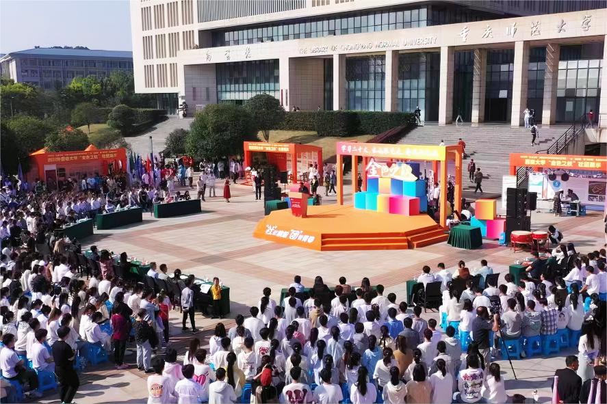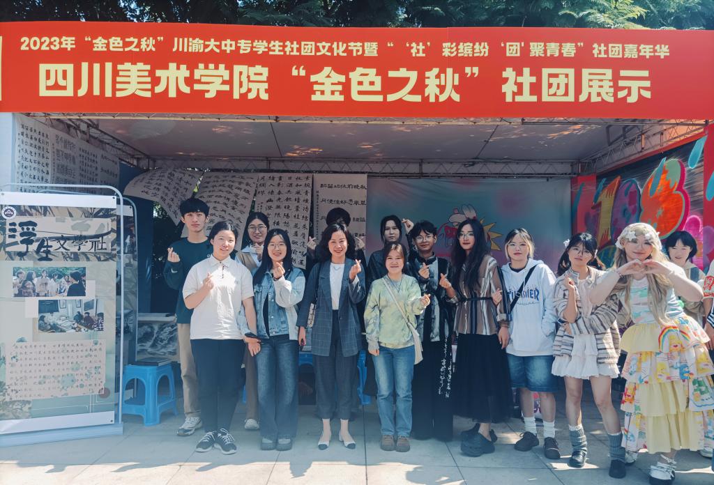 10月15日,由重庆市委教育工委、重庆市教委、共青团重庆市委、共青团四川省委、重庆市学联及四川省学联合主办的2023年“金色之秋”川渝大中专学生社团文化节开幕式暨“‘社’彩缤纷‘团’聚青春”社团嘉年华活动在重庆师范大学举行。来自川渝大中专院校的108个学生社团参与活动。我校两个优秀学生社团:浮生文学社和108POP涂鸦社在校团委书记杨璨的带领下参加了此次活动。