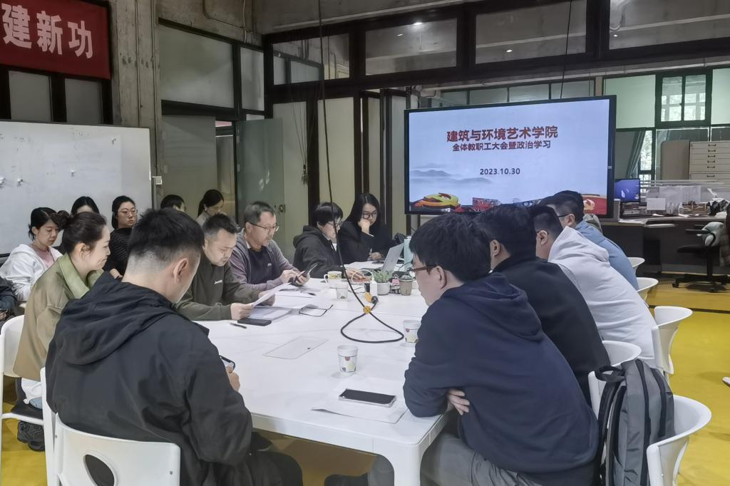 10月30日上午,建筑与环境艺术学院召开全体教职工大会暨政治理论学习会。会议由党总支书记刘建峰主持,院长黄耘、副书记郭辉、副院长黄红春及全体教职工参会。