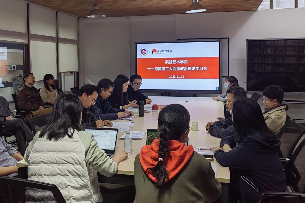 11月23日下午,实验艺术学院召开11月教职工大会暨政治理论学习会。会议由党总支书记吴倩主持,院长李川、副院长曾令香,及全体教职工参会。