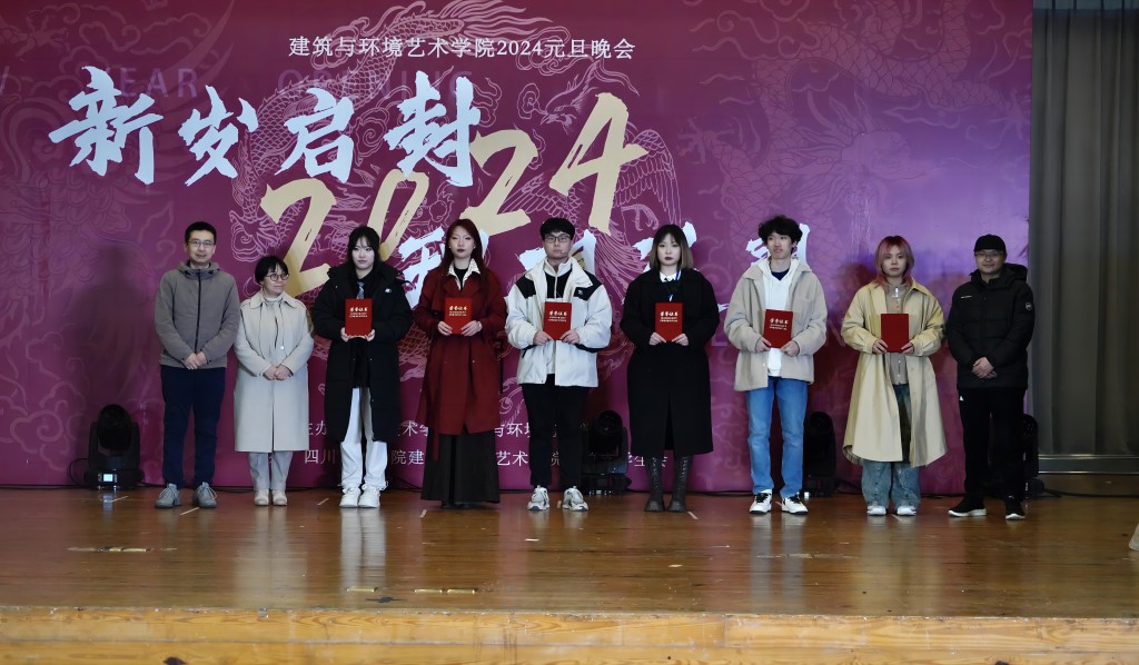 节目之余,为了鼓励先进、树立榜样,鼓舞同学们在新的一年继续努力,再创佳绩。学院党总支书记刘建峰、党总支副书记郭辉、副院长黄红春以及三位专业教师分别为2023年度在志愿服务活动、文体活动、创新创业活动、学生工作等方面表现突出的同学们颁发荣誉证书并合影留念。