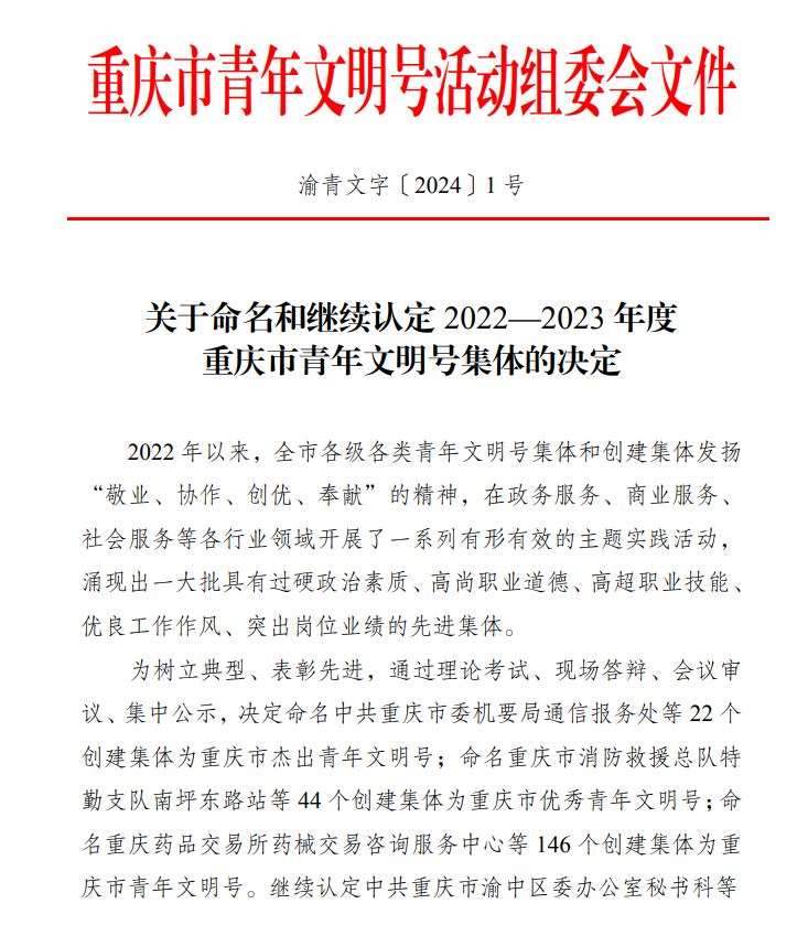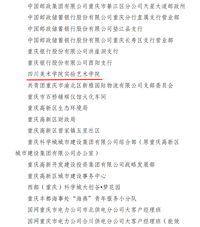 近日,重庆市青年文明号创建活动组委会印发《关于命名和继续认定2022—2023年度重庆市青年文明号集体的决定》。自《关于做好2022—2023年度重庆市青年文明号创建(复核)工作的通知》下发后,校团委高度重视,积极转发并动员二级单位踊跃申请,经过简易备案、对标创建、达标考核、审核认定等一系列程序,我校实验艺术学院成功入选2022—2023年度重庆市青年文明号集体,且为唯一入选的高校基层单位。