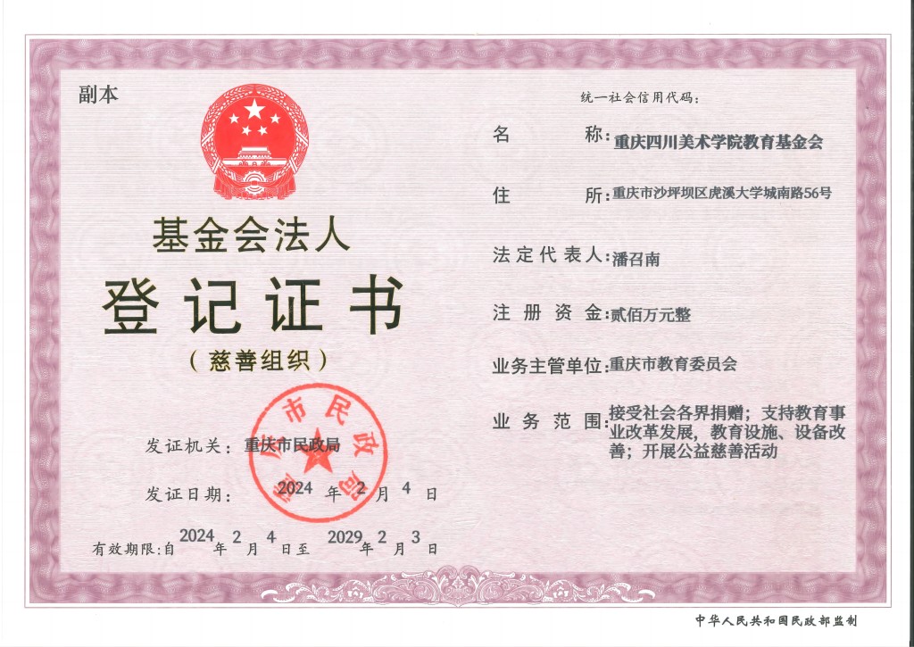 近日,重庆市民政局出具《行政许可决定书》(渝民许准字〔2024〕47号),准予 教育基金会成立登记,同时颁发了《基金会法人登记证书》。