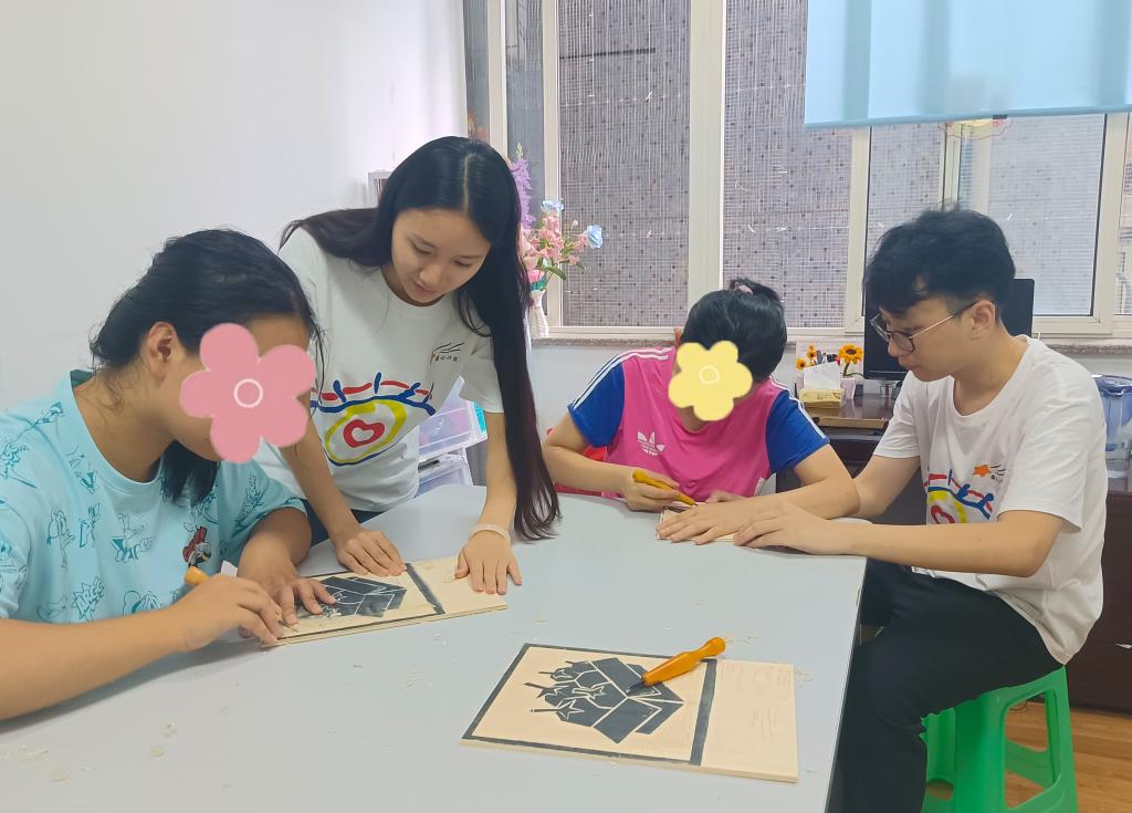 活动现场,来自“星心计划”的志愿者们在特教老师的陪同下,手把手地指导孤独症患者参与版画制作“绘版、刻板、印版”三个环节。这种结合患者刻板行为及重复动作的艺术创作与职业技能培训方式,得到了现场老师的高度评价。