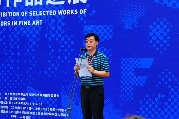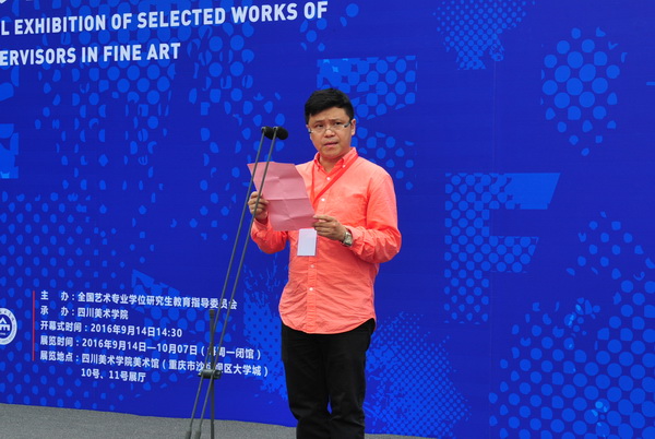 展览开幕式于14日下午2点30分在我校新校区美术馆举行。出席开幕式的有:重庆市人民政府副市长吴刚,重庆市人民政府副秘书长王余果,重庆市委教育工委委员、市教委专职督学张荣,全国艺术专业学位研究生教育指导委员会美术与设计分委会召集人曹意强,全国艺术专业学位研究生教育指导委员会秘书长丁凡,重庆市美协主席、 院长庞茂琨及全体校领导,云南艺术学院院长郭浩,广州美术学院副院长吴卫光,西安美术学院副院长姜怡翔,湖北美术学院副院长许奋,内蒙古艺术学院副院长孟显波,上海大学美术学院院长汪大伟,清华大学美术学院副院长张敢。全国十所美术学院和七所艺术学院的研究生处、美术院系等单位的有关领导,新闻媒体记者, 有关职能部门负责人和各院系研究生等参加了开幕式。开幕式由我校党委书记黄政主持。