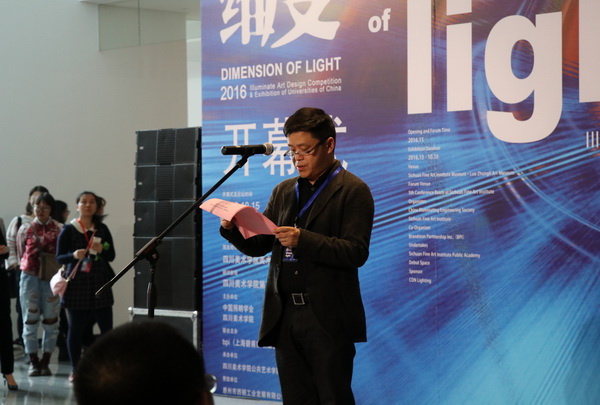 10月15日下午3点30分,“光的维度”2016中国高校照明艺术设计大赛作品展在 美术馆顺利开幕。 院长庞茂琨、中国照明学会秘书长窦林平、惠州市西顿工业发展有限公司常务副总陈实出席开幕式,大赛评委会专家、参赛兄弟院校老师、照明学会及企业代表、照明设计机构代表、我校职能部门和二级院系代表等参加了开幕式。开幕式由公共艺术学院党总支书记钟正武主持。