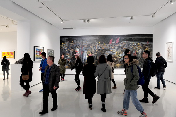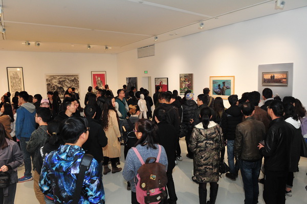 最后,庞茂琨宣布展览正式开幕。本届年展共展出了来自全校14个院系/研究机构、共312名教师的478件作品/研究成果,将持续展至12月4日。这些参展作品生动描绘了全党全国人民在实现中华民族伟大复兴中国梦的伟大历史征程中的壮阔画卷,诗意化地表现党的气质、契合当代中国精神。它们在思想上积极弘扬当代的“长征精神”,题材选择上尊重历史,情感上激越向上,形式上丰富多样,较为充分地展示了我校教师在重大历史题材创作方面的驾驭能力,也体现了本次展览的现实意义:艺术创作不仅要强调艺术自身的规律,还应当面向历史、面对社会、面向公众,在艺术与现实的张力中获得更为强大的生命力。