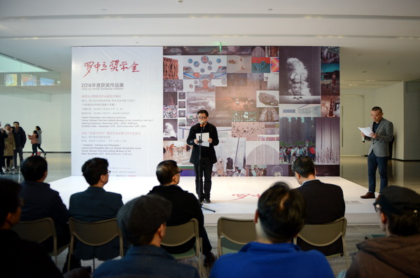 开幕式上,庞茂琨院长代表 向到场的嘉宾及参展艺术家表示感谢,对今年获得罗中立奖学金的青年艺术家表示了热烈祝贺。罗中立奖学金的支持方、浩然艺术与教育基金会仇浩然先生致辞,表达了他对罗中立奖学金及获奖艺术家的美好期望。黄政书记宣读了2016年度罗中立奖学金获奖名单。罗中立教授为获奖学生颁奖。