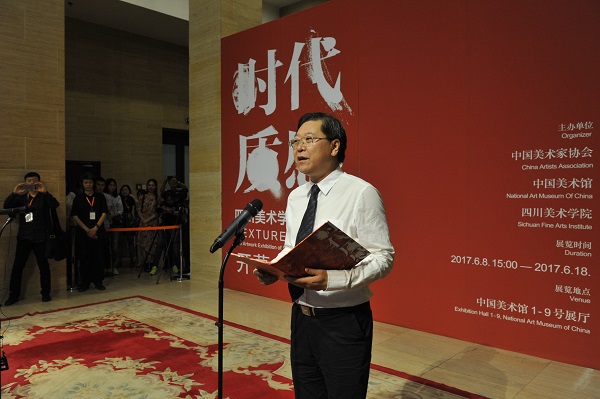 “时代质感—— 作品展”于2017年6月8日下午在中国美术馆隆重开幕。此次展览由中国美术家协会、中国美术馆、 共同举办。四川美术院长庞茂琨代表学校致辞,中国美术馆馆长、中国美协副主席吴为山,全国著名美术批评家代表、资深老专家邵大箴,中国美术家协会分党组书记、常务副主席、秘书长徐里,中国文联副主席、中国美协副主席、中国美术学院院长许江等分别致辞讲话。全国政协常委、原中央美术学院院长靳尚谊宣布展览开幕。开幕式由 党委书记黄政主持。