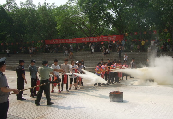 随后,九龙坡区消防支队张参谋讲解了报警流程、自救互救、逃生知识和灭火器的使用方法,使学生开阔眼界,增长了消防知识;公共艺术学院教职工、学生和物业管理人员进行灭火器实际操作演练;最后微型消防站队员进行了链接水带枪头喷水灭火演练。