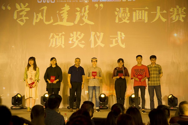 最后,左益为颁奖活动致辞。首先,他祝贺2017届毕业生顺利毕业,也感谢所有教师的辛勤劳动。他从川美校训“志于道,游于艺”出发,要求同学们继续秉承校训,尊重艺术和创作发展的规律,以人民为中心,为社会服务,在创作中关注人民,关注生活。继续在艺术殿堂中畅游,挥洒智慧和艺术力量,继续创作出不愧于母校,不愧于社会的作品。他从“学风建设”漫画大赛一幅作品《行成于思毁于随,业精于勤荒于嬉》告诫同学们要认真思考和规划自己的学业、工作和生活,不能过于随性和放任自流;要勤勤恳恳地不断学习和努力,尤其是毕业生在走出学校进入工作,更要勤奋刻苦,要把在学校中收获的专业知识和能力应用到工作中,做出更好的成绩。在工作中遇到困难和矛盾要想办法去克服和解决,不要轻易放弃,要敢于吃苦,敢于持之以恒。要向优秀的老师、前辈学习,多下苦功夫。 要创建国际知名,国内一流的美术学院,就要培养德艺双馨的艺术家和优秀的接班人和建设者,这需要良好的教风,优良的学风和校风的保证,所以同学们不仅要在“学风建设”漫画大赛中获奖,也希望能在推动校风和学风建设中做好积极的带头作用。