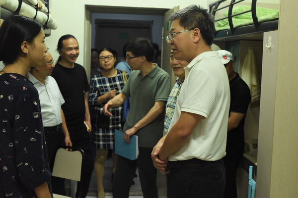 在学生5号楼,黄政书记一行在辅导员值班室看望了正在与值班老师交流的新生们。来自五湖四海的同学们济济一堂,兴奋地讲述来川美的见闻、表达对大学精彩生活的期许。老师们鼓励大家在学习生活之余,挖掘潜能,在校园文化活动、志愿服务、社会实践方面多埋头实干,躬行真知,能知能并重,全面发展。