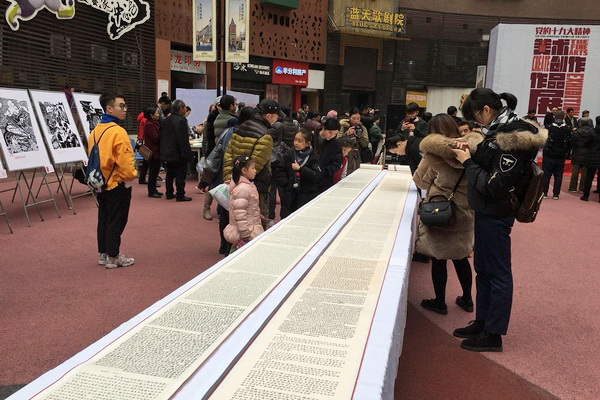 本次展览展出了我校及全市十余所高校美术专业师生的300余件党的十九大精神主题创作作品,广大艺术家和青年学子通过中国画、版画、油画、书法、动画、新媒体艺术、设计艺术等多种艺术表现形式,惟妙惟肖、绘声绘色、美轮美奂地对十九大精神进行了精彩生动的解读。展览现场还面向市民举办了现场书写赠送春联、版画创作体验、为市民肖像写生等丰富的艺术体验活动,得到了广大市民的积极参与和热烈欢迎。